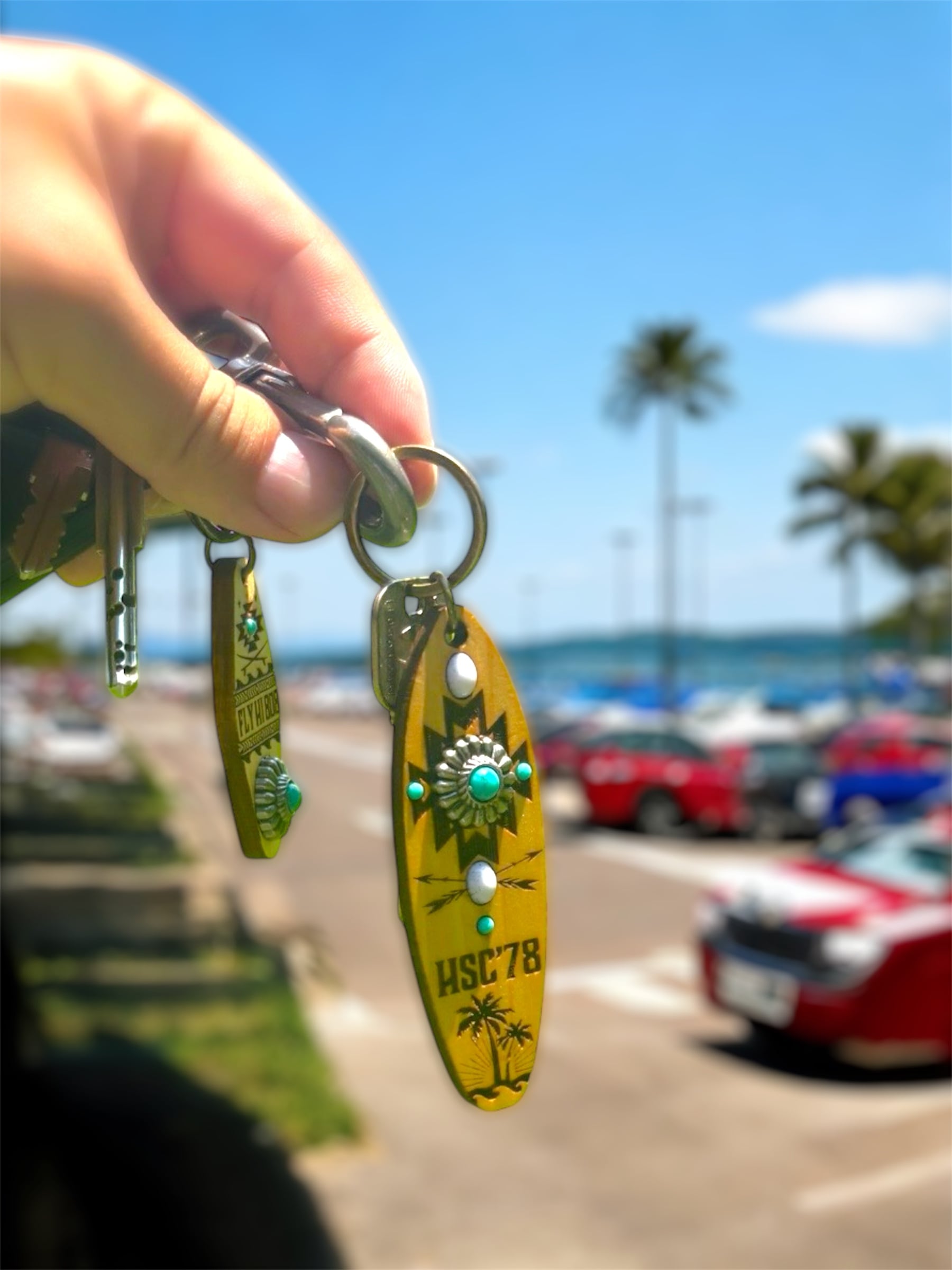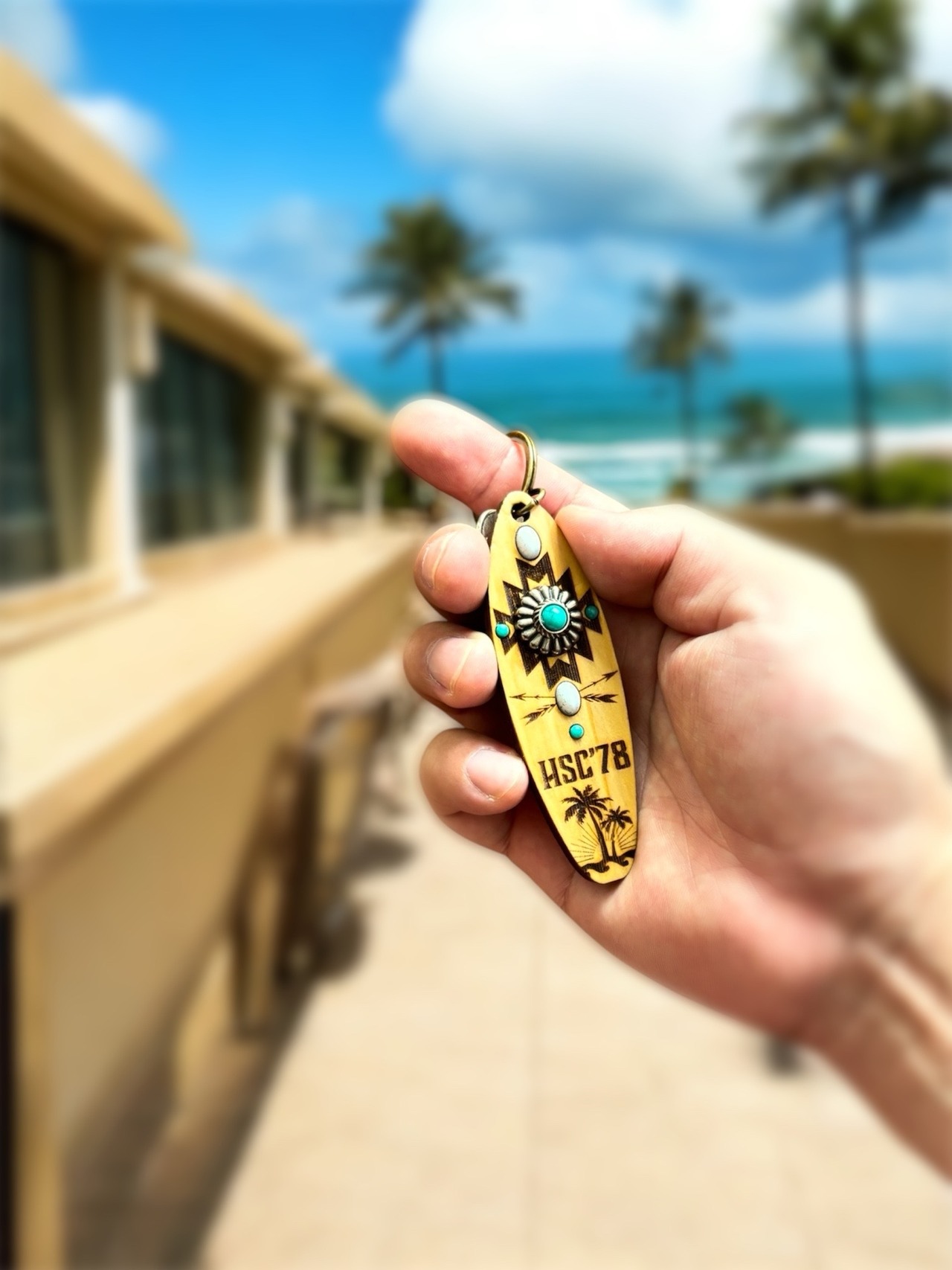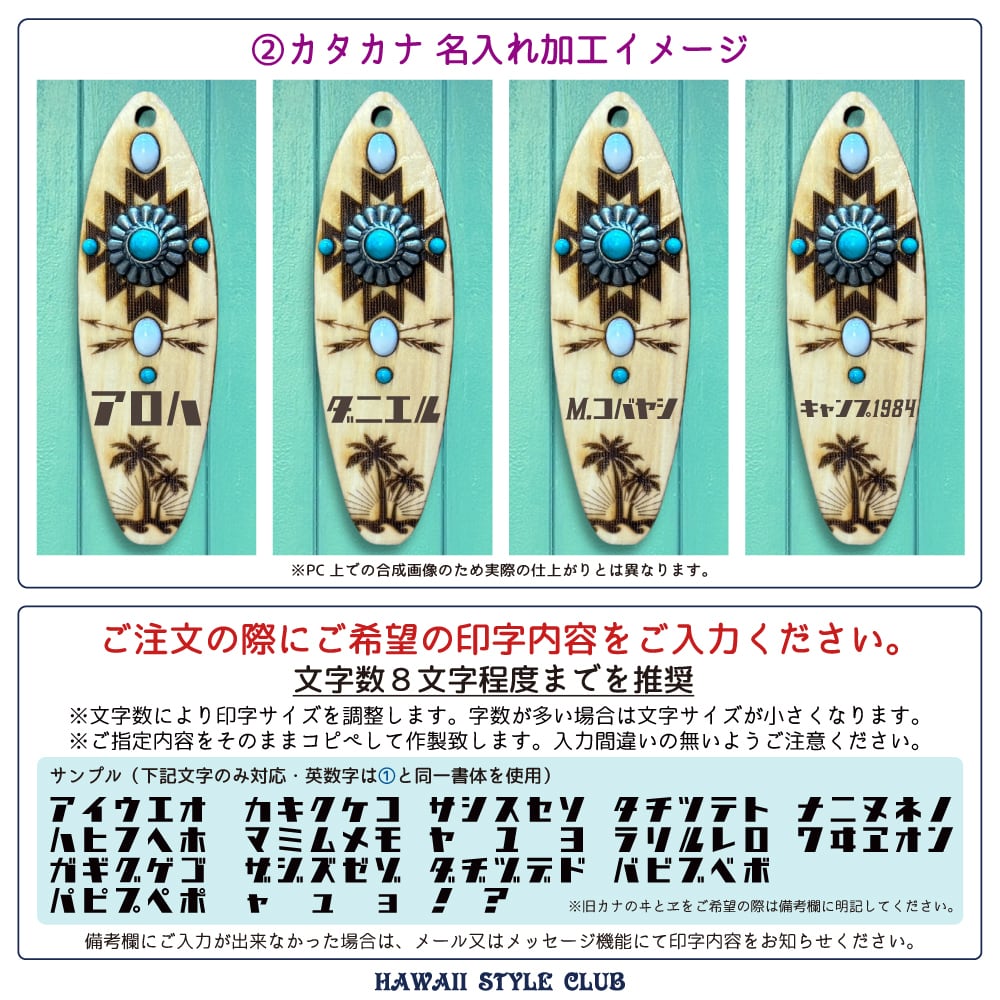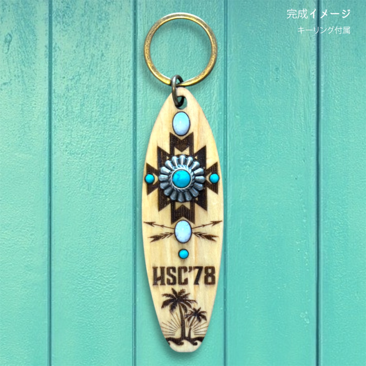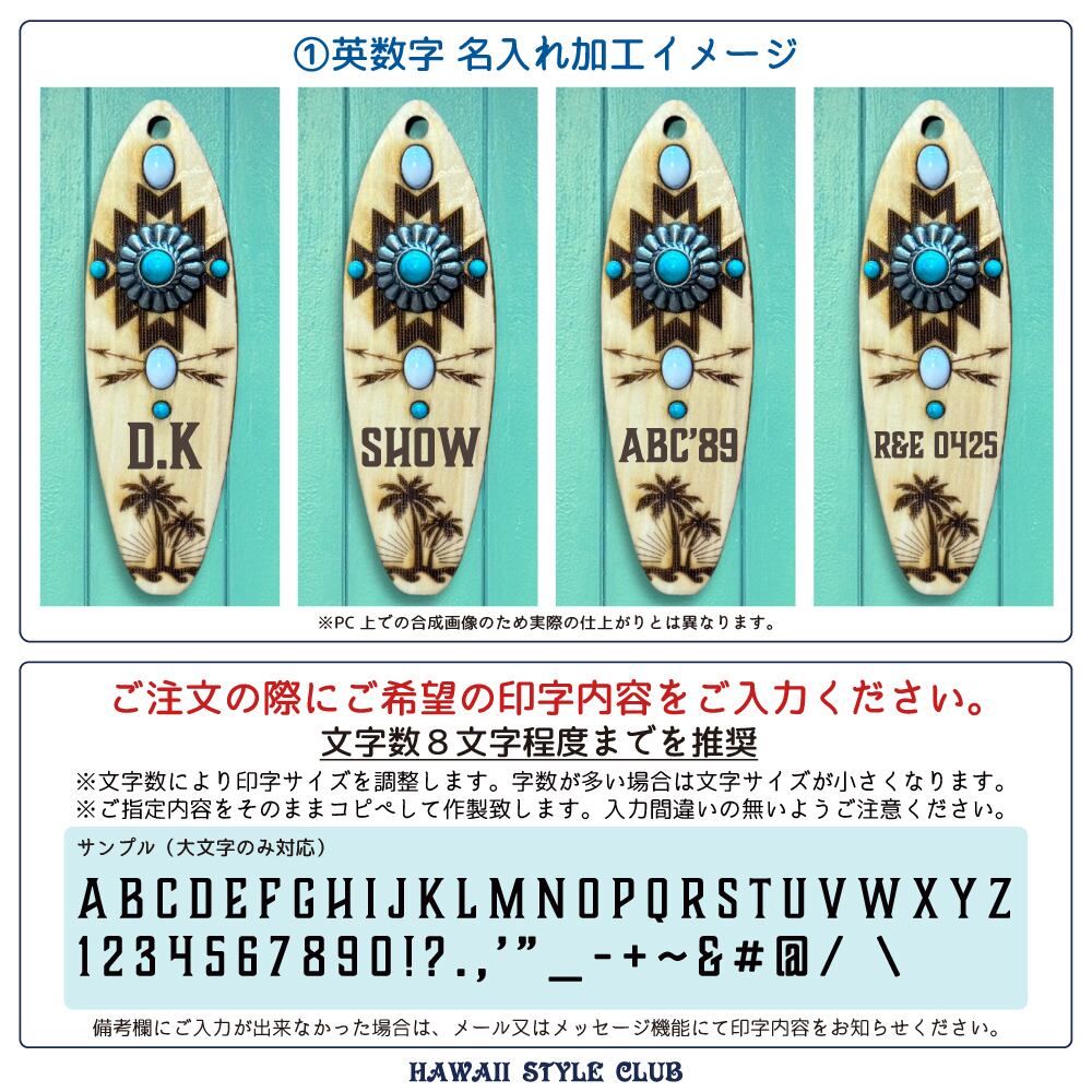 テール部にはヤシの木・太陽・波のシルエットを刻印し、ネイティブ柄とハワイアンテイストが調和したデザインに