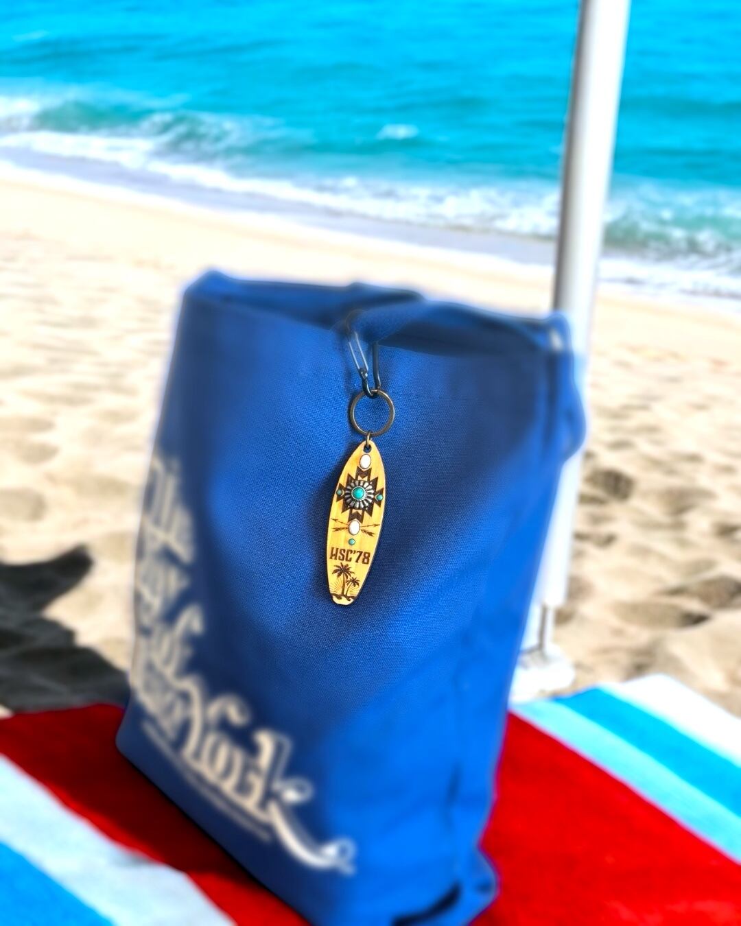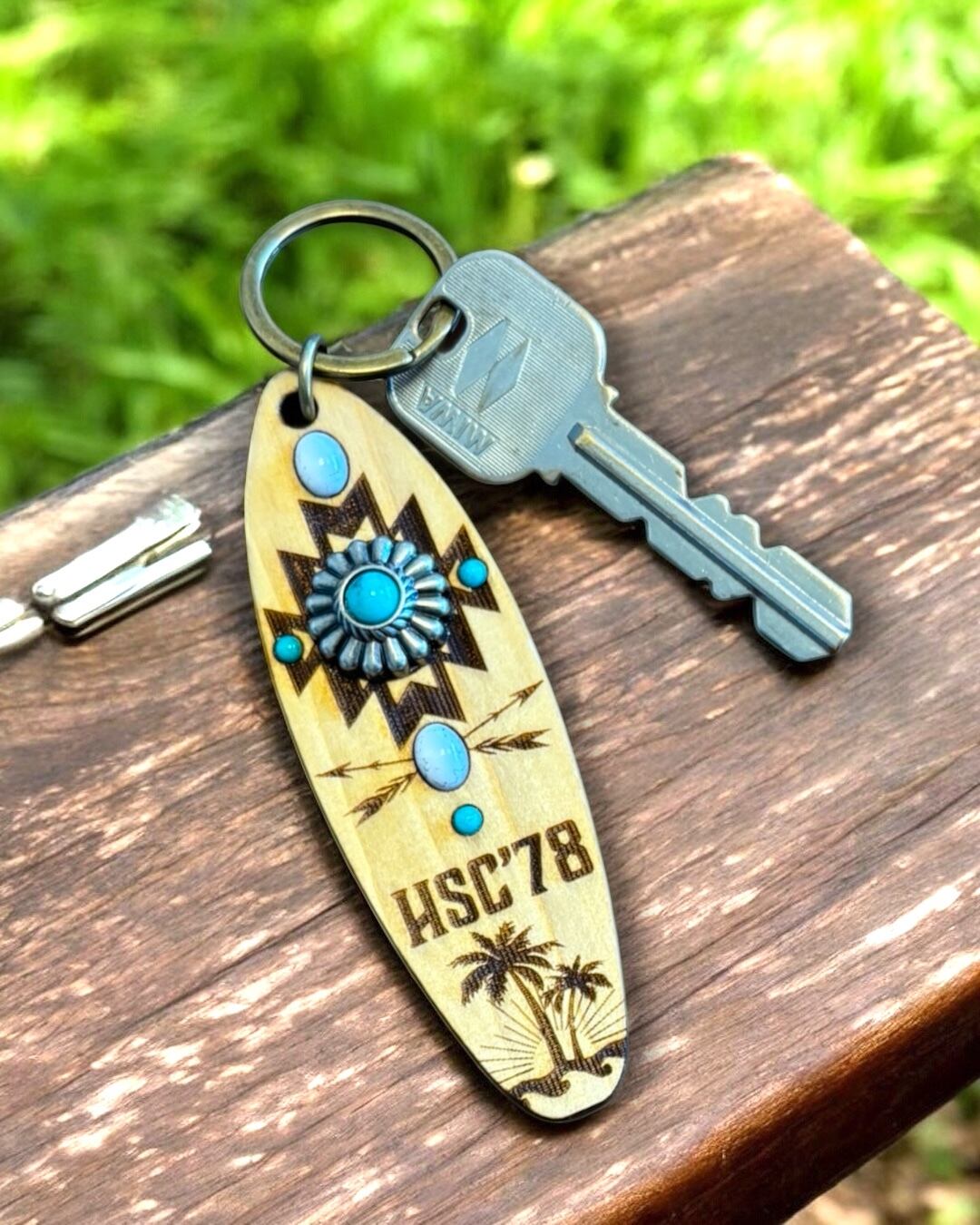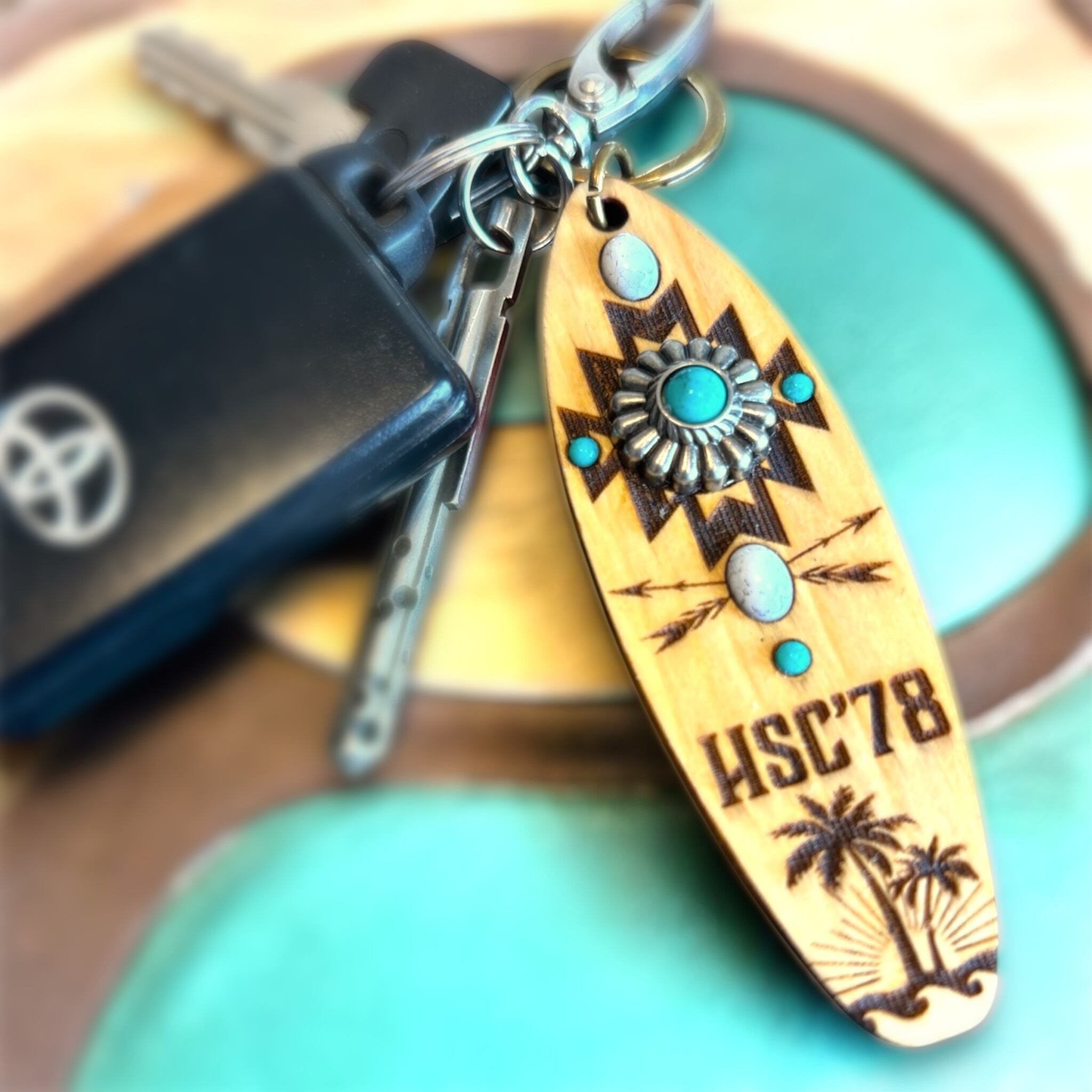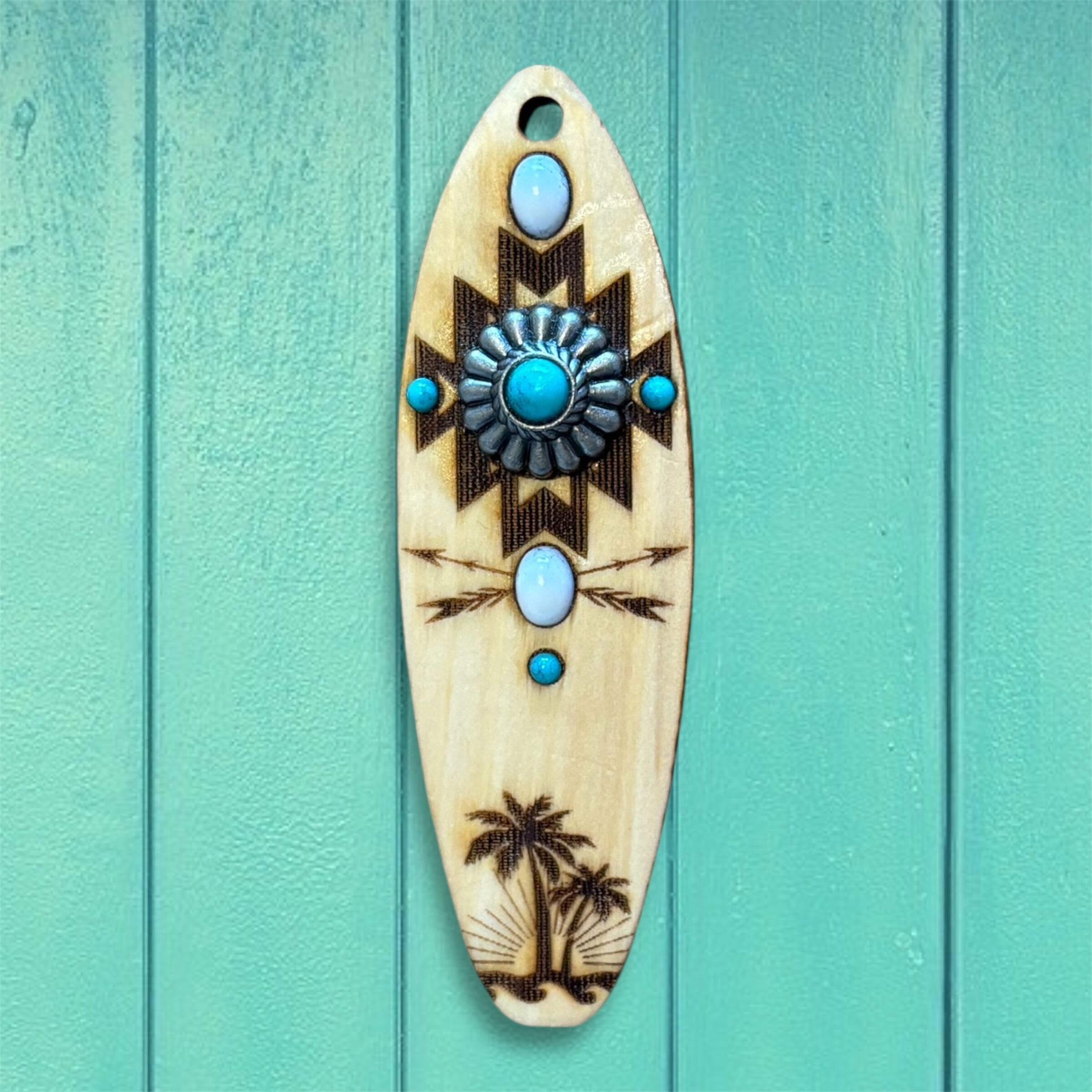 テール部にはヤシの木・太陽・波のシルエットを刻印し、ネイティブ柄とハワイアンテイストが調和したデザインに